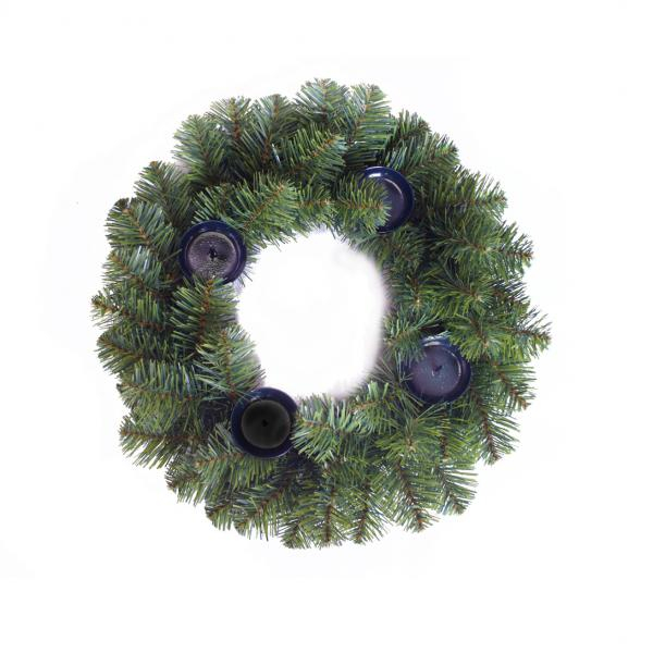 Hustý adventný čačinový veniec DELUXE EVERGREEN so zabudovanými 4 kovovými svietnikmi na sviečky. Priemer venca: 38 cm.
