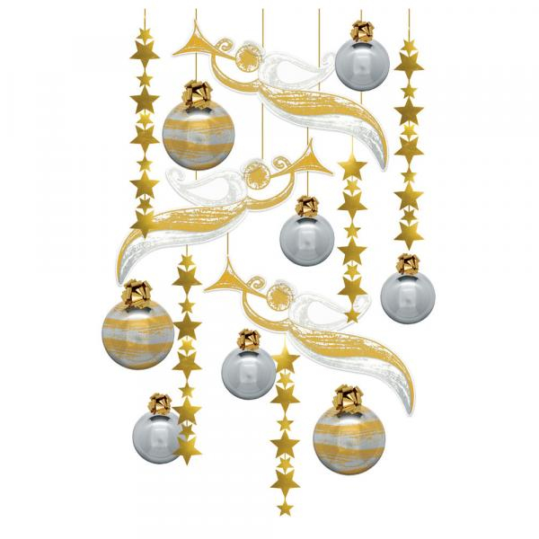 Skupina 16 rôznych nadrozmerných bielo - zlatých vianočných ozdôb. V skupine sú namixované nadrozmerné gule, hviezdičky a anjeli v prijemných sviatočných odtieňoch bielej a zlatej farby. Veľkosť dekorácie v rozloženom stave je 170 x 250 cm.