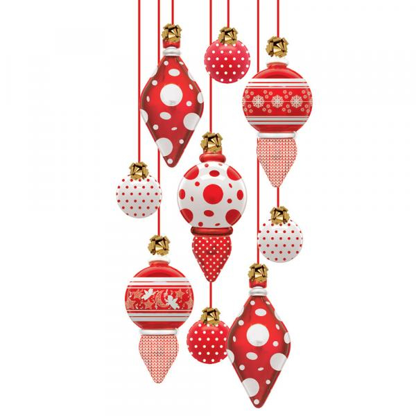 Skupina 9 rôznych nadrozmerných vianočných ozdôb v elegantnej bielo - červenej farebnej kombinácii. V skupine sú namixované nadrozmerné gule a ozdoby rôznych priemerov a tvarov. Veľkosť dekorácie v rozloženom stave je 125 x 260 cm.
