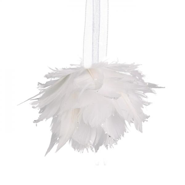 Nádherné snehovo-biele závesné vianočné gule sú vytvorené so zmyslom pre detail a zdobené sú pierkami, korálkami, drobnými trblietkami a saténovou stužkou na zavesenie, čo im dodáva štýlový a luxusný vzhľad.