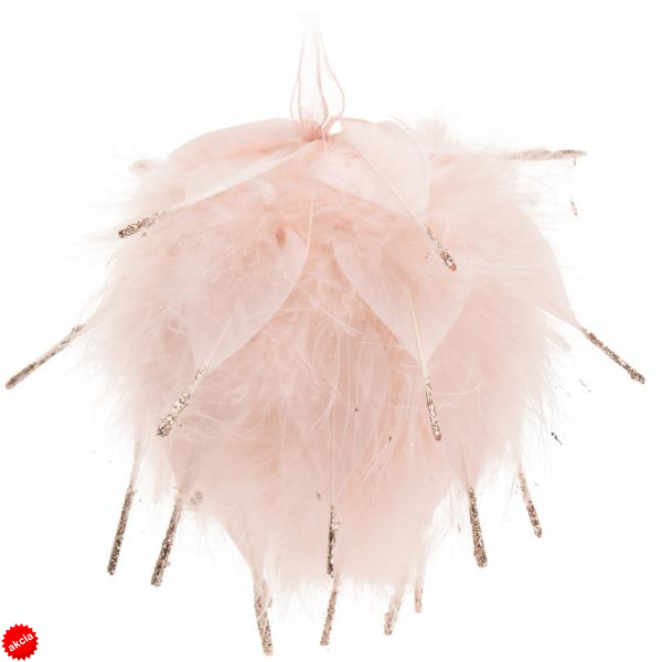 Závesné vianočné gule v jemnej marhuľovo - ružovej farbe sú vytvorené so zmyslom pre detail a zdobené sú pierkami, korálkami, drobnými trblietkami a saténovou stužkou na zavesenie, čo im dodáva štýlový a luxusný vzhľad.