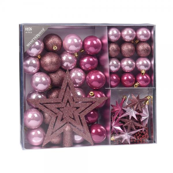 Sada 45 ks rôznych plastových vianočných ozdôb na vianočný stromček. Set obsahuje : 12 ks x 50 mm lesklé vianočné gule, 12 ks x 50 mm matné vianočné gule, 4 ks x 40 mm lesklé vianočné gule, 4 x 40 mm matné vianočné gule, 4 x 40 mm trblietkové vianočné gule, 4m korálkovej retiazky, 7 ks x 80 mm vianočné hviezdy, 1 ks x 20 cm vianočná špica. Balené v darčekovej škatuli 33x30x6 cm. K dispozícii v niekoľkých farebných prevedeniach.