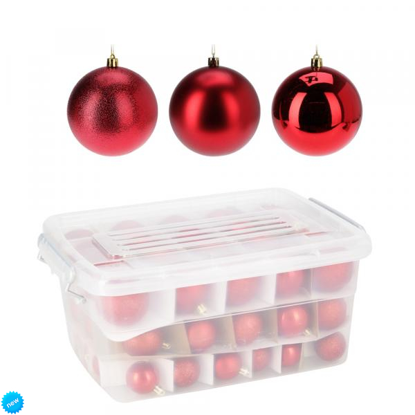 Každá veľkosť obsahuje mix troch povrchových úprav: matná, lesklá a reliéfna, čo dodá stromčeku bohatý a žiarivý vzhľad. Celá sada je prakticky zabalená v úložnej krabici s vekom, ktorá zabezpečí jednoduché skladovanie a ochranu ozdôb aj po sviatkoch.