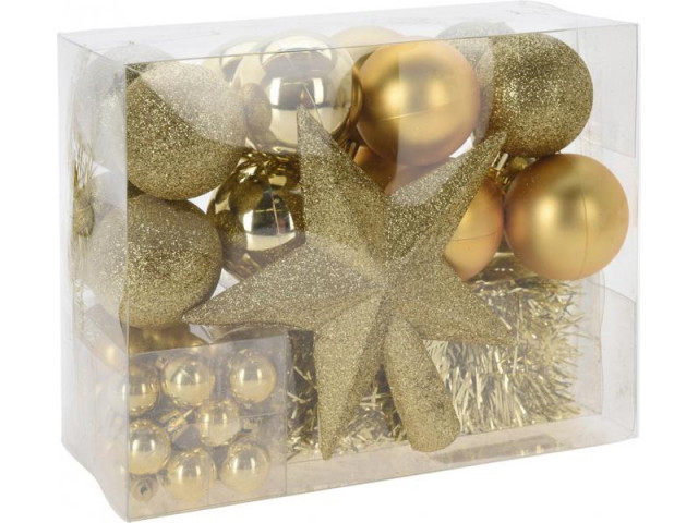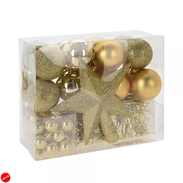 V každej sade nájdete 1 hviezdu na stromček s rozmermi 15 cm, fóliovú girlandu s dĺžkou 3 m, 16 ks vianočných gúľ s priemerom 5 cm a 36 ks vianočných gúľ s priemerom 2 cm.