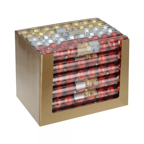 Máme pre Vás krásne farebné plastové vianočné gule. Sady sú dostupné v troch farebných variantoch: červenej, zlatej a striebornej. V každom balení nájdete kombináciu matných vzorovaných a lesklých vzorovaných vianočných gúľ s priemerom 5 cm. Každé balenie obsahuje 8 kusov gúľ.
