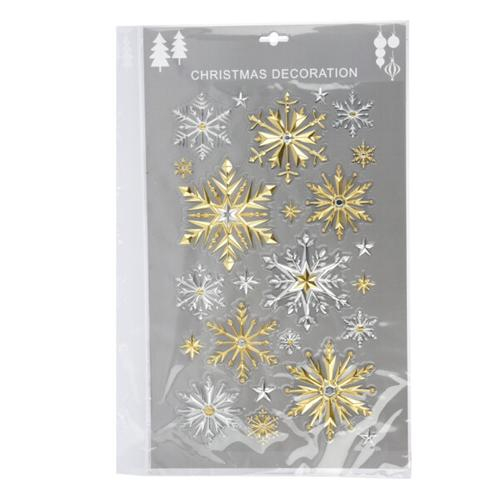 Metalické vianočné nálepky na sklo v elegantných farbách a vianočných motívoch. Nálepky sú viacnásobne použiteľné a je možné ich opätovne nalepiť a odlepiť. K dispozícii sú 2 druhy nálepiek s rôznymi vianočnými motívmi. Veľkosť každého plátku s nálepkami : 29 x 41 cm.