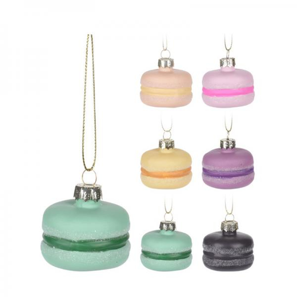 Roztomilá sada 6 ks sklenených farebných makaróniek s drobnými trblietkami a šnúrkou na zavesenie poteší každého milovníka francúzskej kuchyne a sladkých potešení. V pevnej škatuľke sú namixované sklenené makrónky v 6 veselých farbách: béžovej, ružovej, žltej, fialovej, zelenej a antracitovej farbe. Rozmer každého makarónu je 4,5x4,5x3,8 cm a celková veľkosť balenia je 32,5x8x5,5 cm.