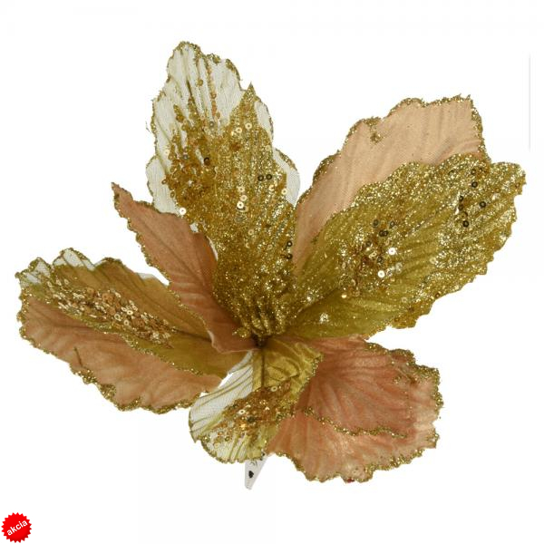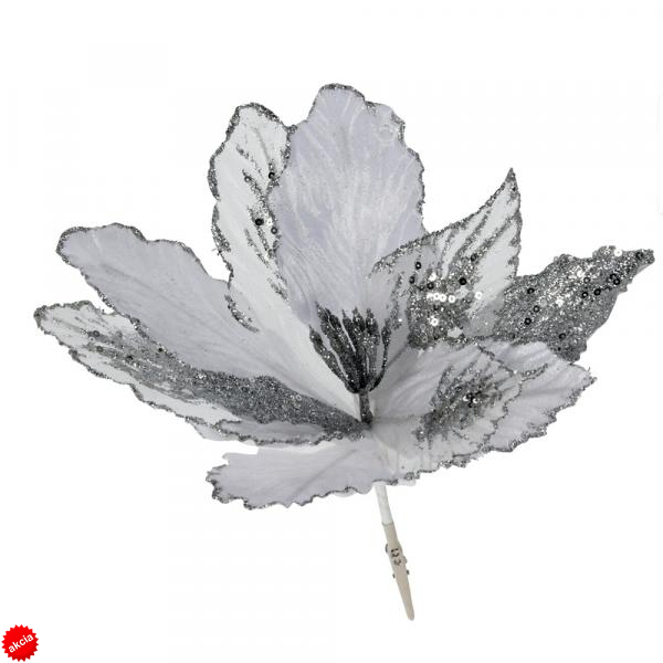 Predstavujeme nádherný veľký látkový vianočný kvet s trblietkami na štipci. Tento kvet je vyrobený z kvalitnej a na dotyk príjemnej zamatovej a tylovej látky, ktoré kvetu dodávajú luxusný vzhľad. Lístky kvetov sú zaujímavo zdobené trblietkami a k dispozícii sú tieto krásne kvety v troch nádherných vianočných farbách: zlatá, strieborná a červená. Môžete si vybrať tú, ktorá najlepšie doplní Vašu vianočnú výzdobu a prinesie domovu ten správny vianočný lesk.