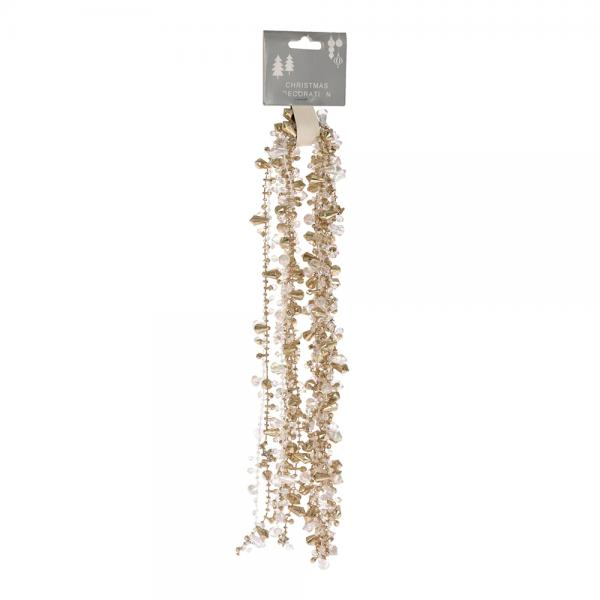Hustá korálková girlanda dodá vianočnej výzdobe štýlový a elegantný dotyk. Girlanda je zdobená peknými kamienkami, sklíčkami a korálkami v elegantnej kombinácii zlatej a bielej farby, čo jej dodáva sofistikovaný a stále aktuálny vzhľad. Korálková girlanda je precízne vyrobená a každý detail je starostlivo premyslený.