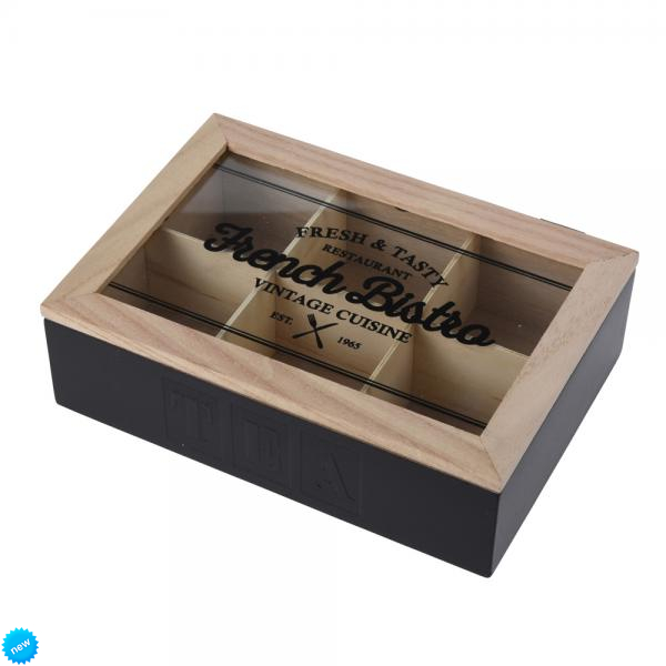 Drevená darčeková škatuľka so 6 priehradkami na rýchle a prehľadné uskladnenie akýchkoľvek porciovaných čajových vrecúšok. Škatuľka má pekný drevený rám so skleneným príklopom a peknou textovou potlačou.