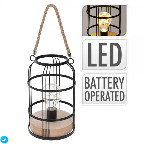 Elegantná stolová lampa s kovovým krytom, kontrastným dreveným stojanom, pôsobivou rúčkou z kokosového povrazu a efektnej žiarovky s drôtikom s 10 LED diódami vnútri. Lampu je vhodná na bežné použitie v interiéri alebo v exteriéri (balkóny, prekryté terasy, verandy, záhrady a podobne ), kde je však potrebné chrániť ju pred nepriaznivým počasím (voda, dážď, sneh, mráz). Lampa má napájanie na tužkové baterky.